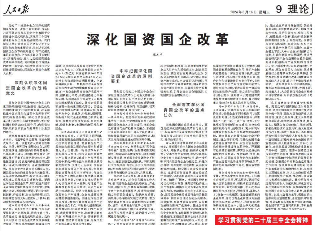 黨的二十屆三中全會(huì)對深化國資國企改革進(jìn)一步作出重大部署,這是以習(xí)近平同志為核心的黨中央著眼于全面推進(jìn)中國式現(xiàn)代化、實(shí)現(xiàn)第二個(gè)百年奮斗目標(biāo)作出的重要戰(zhàn)略安排。我們要深入學(xué)習(xí)領(lǐng)會(huì)習(xí)近平總書記關(guān)于全面深化改革的重要論述,深刻認(rèn)識(shí)深化國資國企改革的戰(zhàn)略意義,牢牢把握改革的正確方向,全力落實(shí)好各項(xiàng)關(guān)鍵任務(wù),以更高站位、更大力度把國資國企改革向縱深推進(jìn),更好地履行國資國企的新責(zé)任新使命,為以中國式現(xiàn)代化全面推進(jìn)強(qiáng)國建設(shè)、民族復(fù)興偉業(yè)作出更大貢獻(xiàn)。