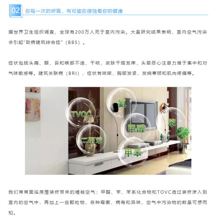 我們常常面臨房屋裝修帶來的糟糕空氣:甲醛、苯、苯系化合物和TOVC透過裝修滲入到室內(nèi)的空氣中,再加上一些顆粒物,各種霉菌、病毒和異味,空氣中污染物的數(shù)量可想而知。