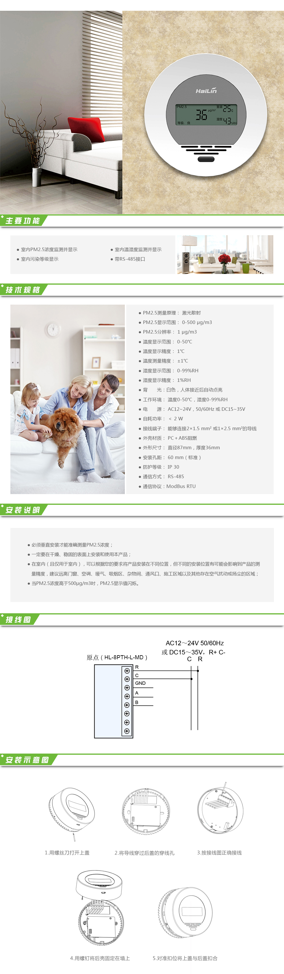 海林原點(diǎn)PM2.5傳感器可實(shí)現(xiàn)室內(nèi)空氣質(zhì)量的實(shí)時(shí)監(jiān)測,通過光散射原理對空氣中的PM2.5進(jìn)行檢測,由微處理器對檢測數(shù)據(jù)進(jìn)行運(yùn)算并將運(yùn)算結(jié)果與污染等級同時(shí)顯示在液晶上,同時(shí)集成了溫濕度的測量與顯示。采用表面安裝方式可實(shí)現(xiàn)對室內(nèi)PM2.5濃度、溫度及濕度進(jìn)行測量并顯示,通過RS485(Modbus)將數(shù)據(jù)上傳。帶紅外接近感應(yīng)功能,有人接近傳感器前方時(shí)啟動(dòng)一次粉塵檢測,同時(shí)點(diǎn)亮背光,便于用戶查看PM2.5濃度以及溫度、濕度等數(shù)據(jù)。