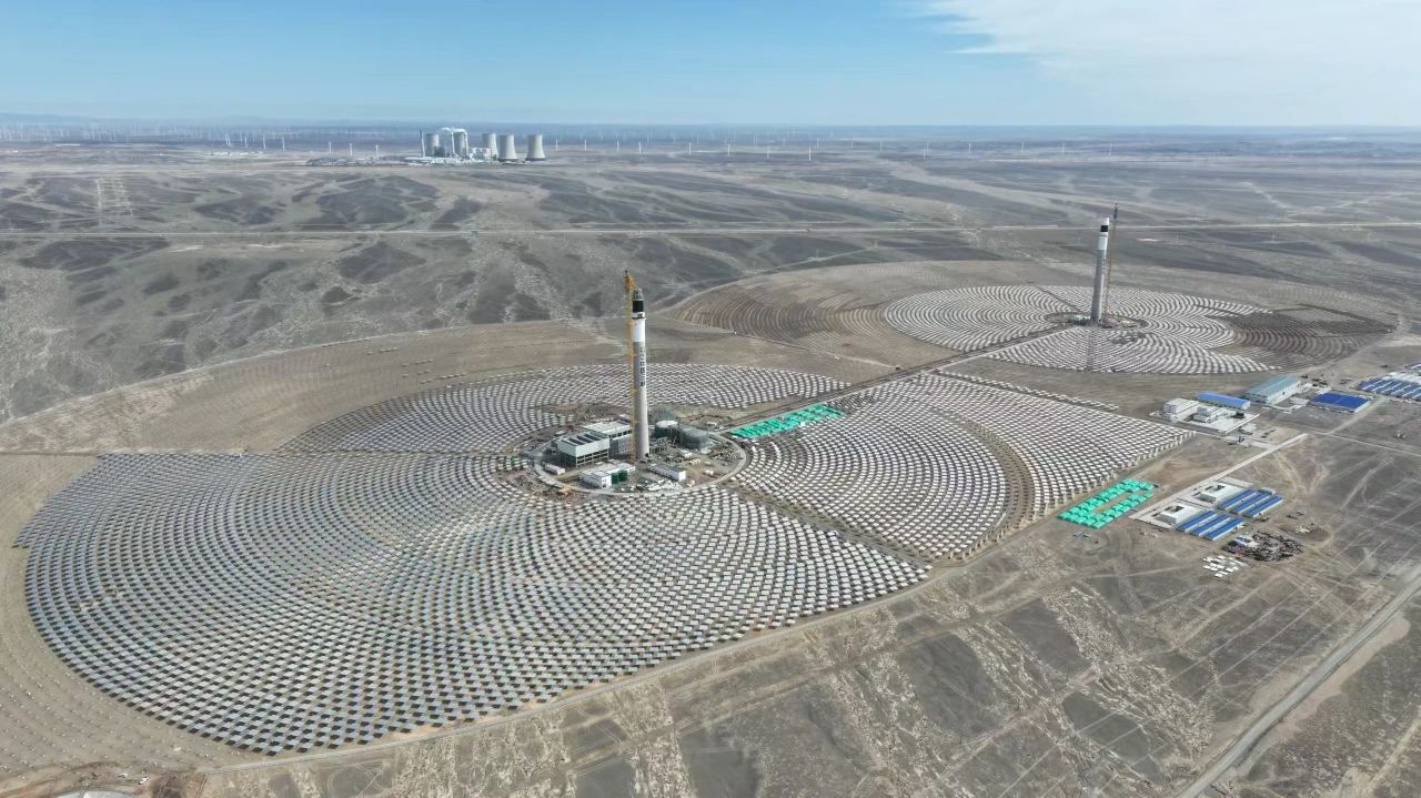 三峽恒基能脈瓜州項(xiàng)目是國家“沙戈荒”新能源大基地標(biāo)桿工程,其創(chuàng)新的雙塔設(shè)計(jì)通過東西兩座約200米高的吸熱塔與4400畝鏡場協(xié)同運(yùn)行,在同等鏡場面積下可提升約24%的聚光效率,進(jìn)而提高發(fā)電能力。哈電鍋爐為此項(xiàng)目量身研制的吸熱器設(shè)備,采用自主研發(fā)的熔鹽介質(zhì)高效吸熱技術(shù),攻克了吸熱涂料的附著、模塊化結(jié)構(gòu)設(shè)計(jì)及組裝三大核心難題。其中,管材選用及相應(yīng)的結(jié)構(gòu)設(shè)計(jì)確保設(shè)備在極端工況下的長期穩(wěn)定性;模塊化設(shè)計(jì)則通過標(biāo)準(zhǔn)化組件拼裝,實(shí)現(xiàn)雙塔吸熱系統(tǒng)與儲(chǔ)能裝置的高效聯(lián)動(dòng),為全球光熱電站建設(shè)提供可復(fù)制的“中國方案”。