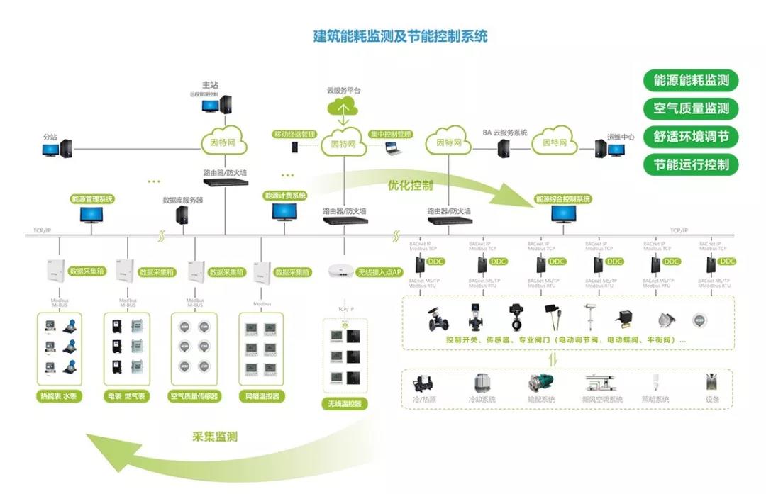 通過(guò)云平臺(tái)將能耗監(jiān)測(cè)系統(tǒng)和節(jié)能控制系統(tǒng)互聯(lián),通過(guò)各種傳感器和監(jiān)測(cè)軟件,實(shí)現(xiàn)對(duì)建筑內(nèi)各個(gè)環(huán)節(jié)各個(gè)區(qū)域的數(shù)據(jù)監(jiān)測(cè),并對(duì)采集到的數(shù)據(jù)進(jìn)行運(yùn)算、優(yōu)化,再把優(yōu)化以后的數(shù)據(jù)運(yùn)用到控制模塊,如機(jī)房的機(jī)主、管道系統(tǒng)的水泵、閥門(mén),室內(nèi)的溫度、濕度、空氣質(zhì)量控制器等,有效調(diào)控這些設(shè)備的工作狀態(tài),最終實(shí)現(xiàn)整個(gè)建筑的舒適、健康和節(jié)能。