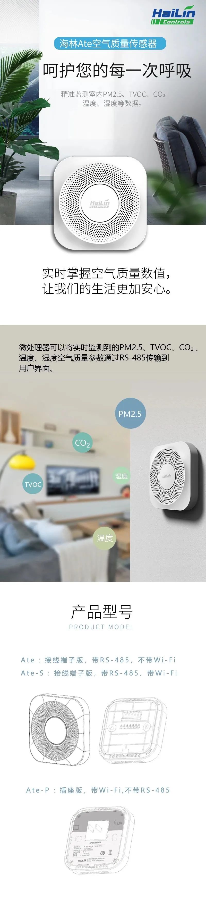 海林Ate 是一款五合一的空氣質量傳感器,用于室內多種空氣參數(shù)的測量,包括溫度、濕度、PM2.5、CO?/eCO? 和 TVOC。配備 Wi-Fi、RS-485、LoRa 或 ZigBee 等多種通訊方式, 適用于各種樓宇自控系統(tǒng)。