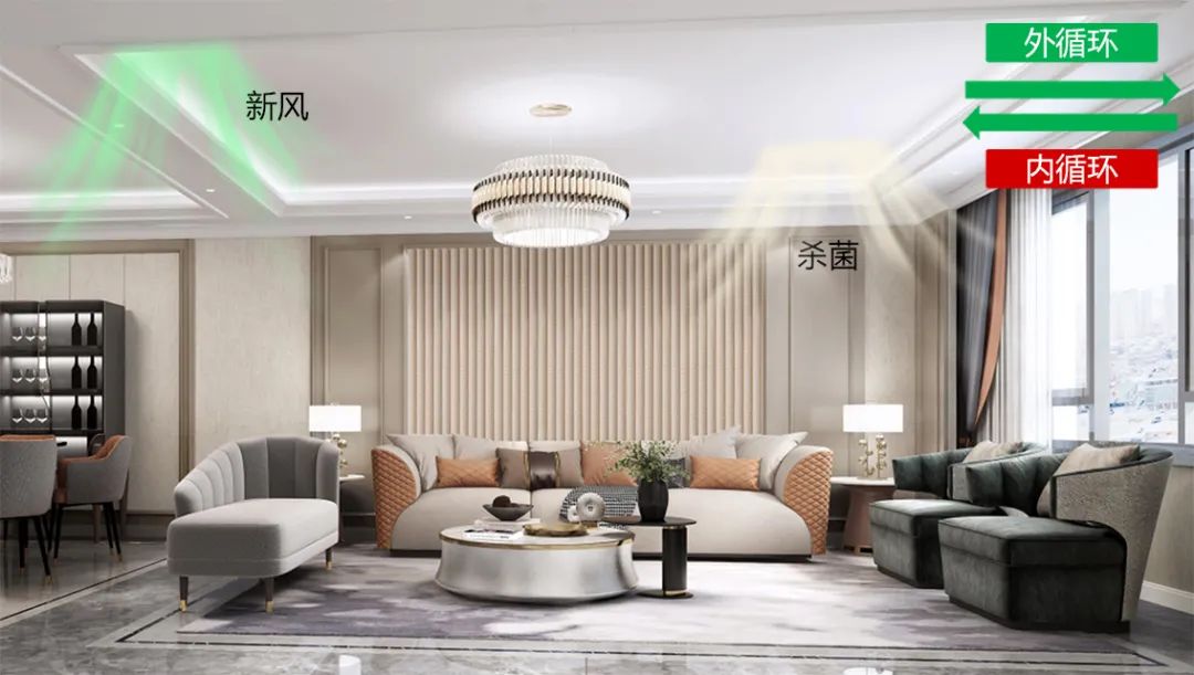 當(dāng)室內(nèi)較大顆粒(5~10μm以及大于10μm,通常為飛沫、灰塵、花粉等)指數(shù)比較高時,容易讓細(xì)菌和病毒長期滯留在室內(nèi)環(huán)境中,系統(tǒng)此時會自動開啟新風(fēng)凈化設(shè)備,通過凈化濾網(wǎng)降低較大顆粒物的存留;