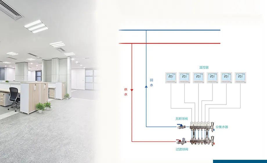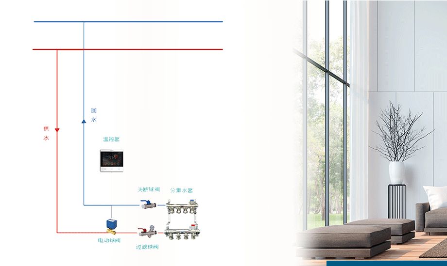 這套系統(tǒng)比較適用于對(duì)溫度要求精準(zhǔn)的別墅、公寓、寫(xiě)字樓、住宅等。分集水器上每個(gè)控制閥加裝電熱執(zhí)行器,再由各個(gè)區(qū)域的溫控器控制,極大程度滿足個(gè)性化需求,按需、時(shí)智能配置每個(gè)房間的溫度,房間獨(dú)立恒溫、舒適節(jié)能。