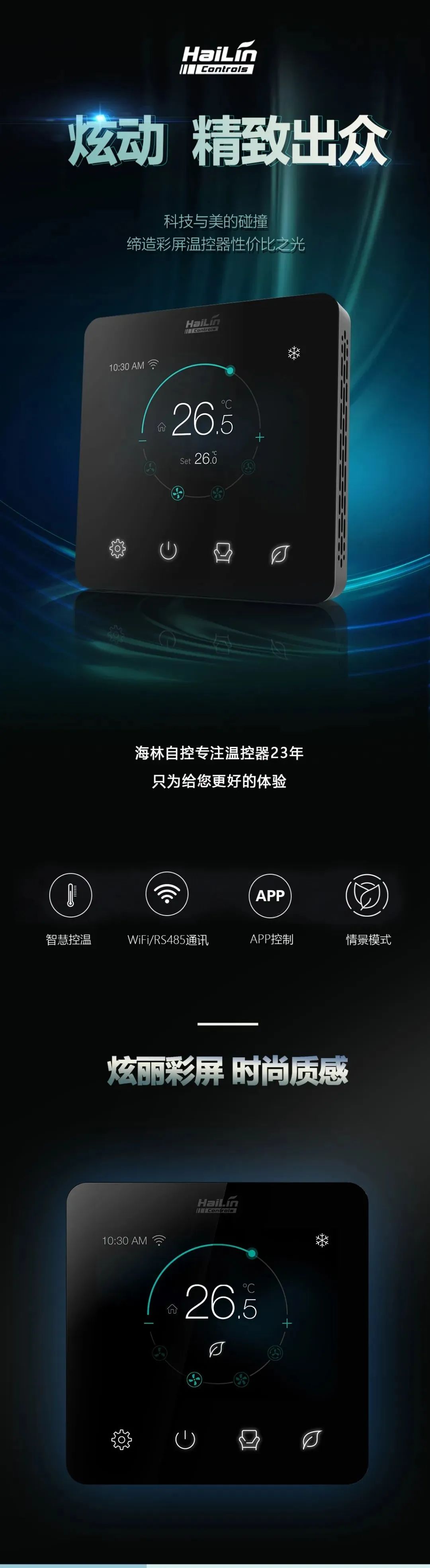 海林炫動溫控器適用于中央空調(diào)及供熱采暖的室內(nèi)溫度控制。