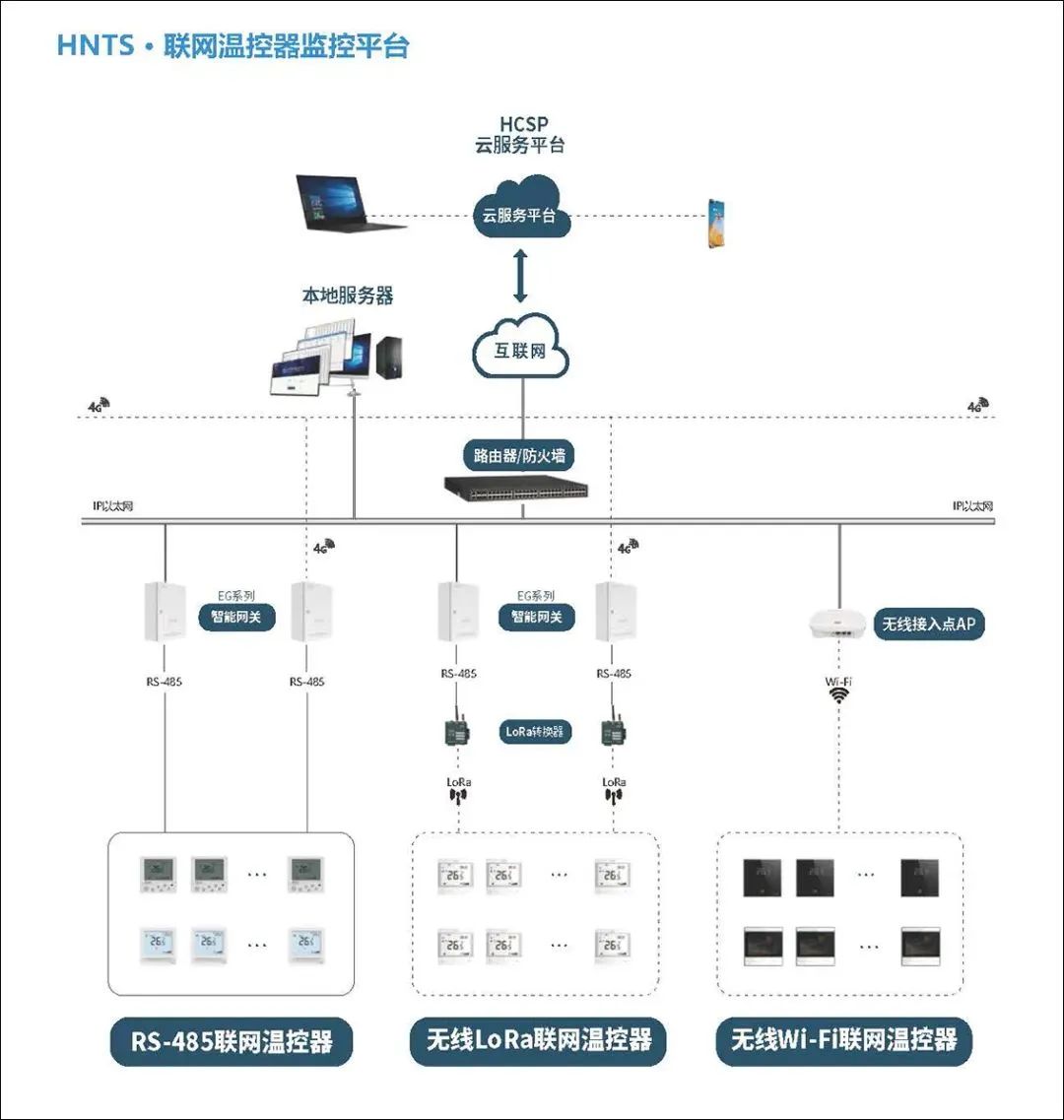 海林HNTS末端溫控器集控系統(tǒng)集自動化控制技術(shù)、計(jì)算機(jī)網(wǎng)絡(luò)技術(shù)于一體,可同時(shí)集中或獨(dú)立對多臺末端設(shè)備的啟停、水閥的開閉及溫度設(shè)置進(jìn)行控制。有三種聯(lián)網(wǎng)集控方式:RS-485 有線方式、 LoRa 無線方式和 Wi-Fi 無線方式。