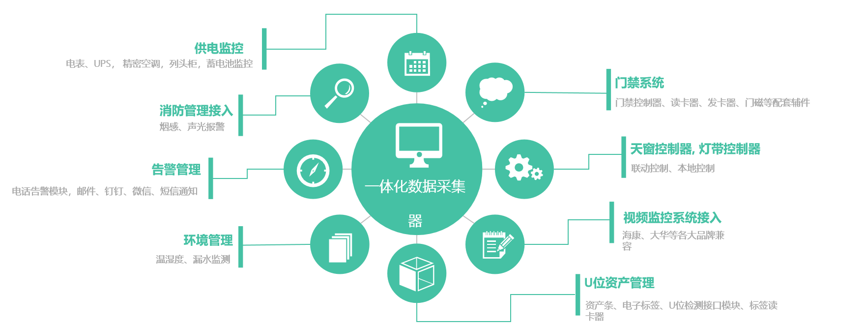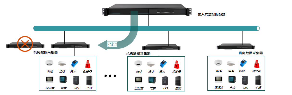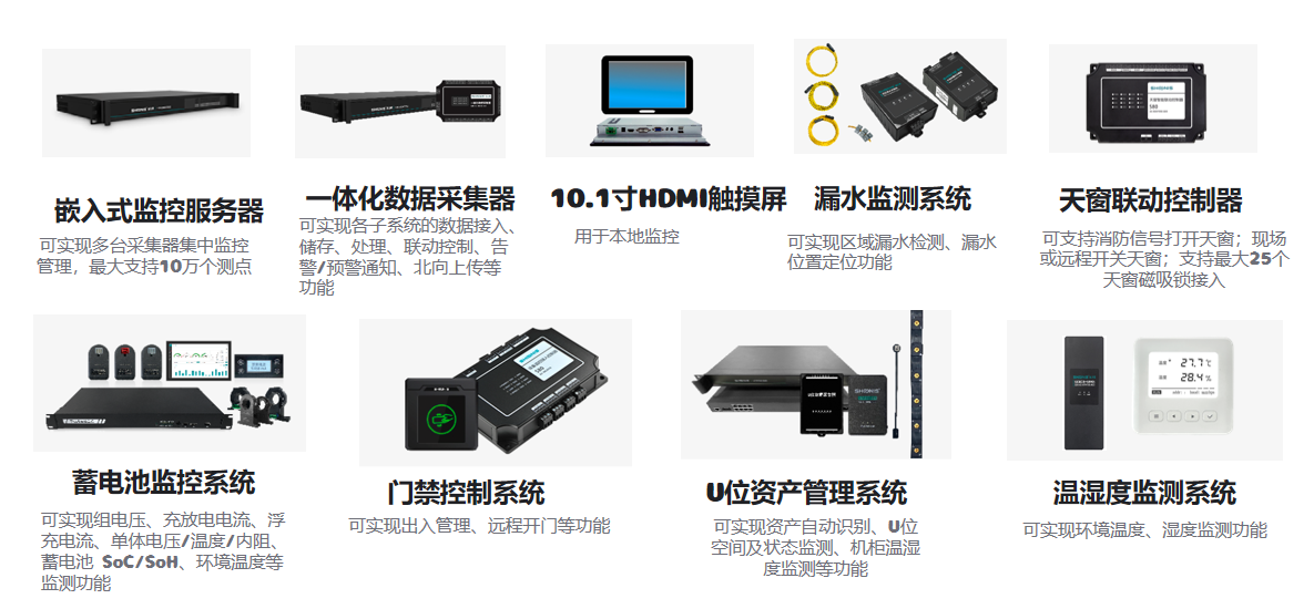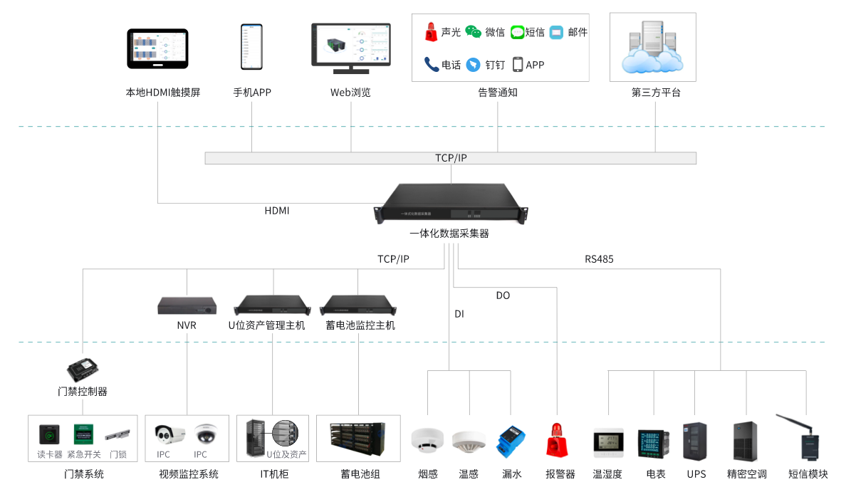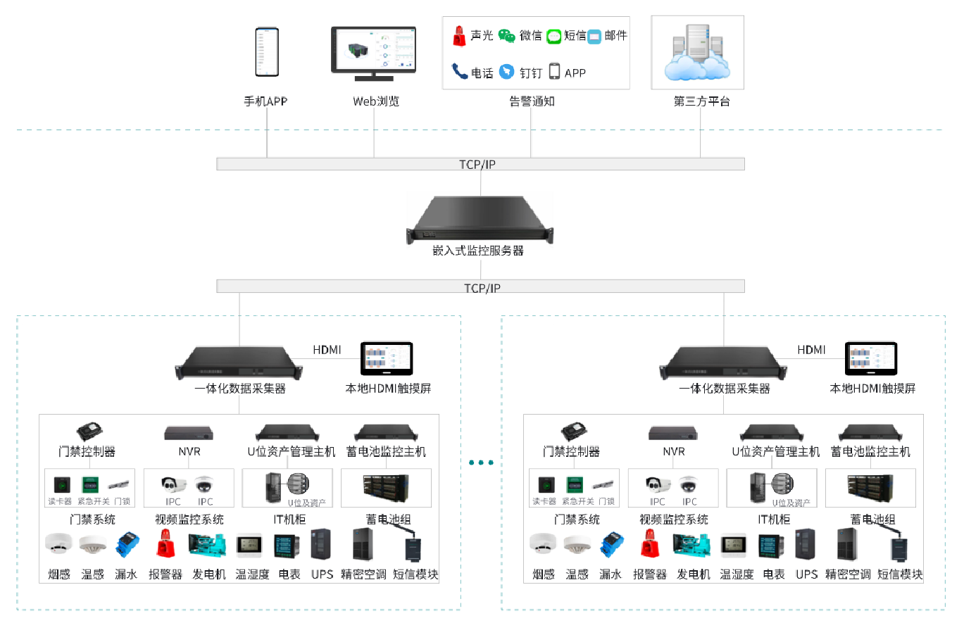 該系統(tǒng)由:嵌入式監(jiān)控服務(wù)器、一體化數(shù)據(jù)采集器、HDM觸摸屏、漏水監(jiān)測系統(tǒng)、天窗聯(lián)動控制器、蓄電池監(jiān)控系統(tǒng)、門禁控制系統(tǒng)、U位資產(chǎn)管理系統(tǒng)、溫濕度監(jiān)控系統(tǒng)組成