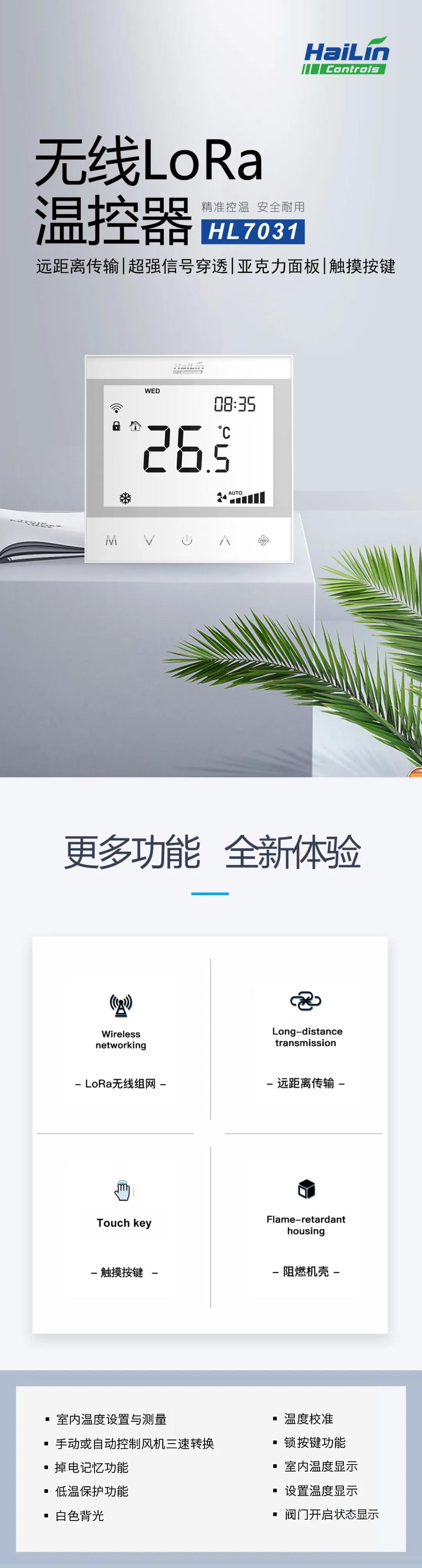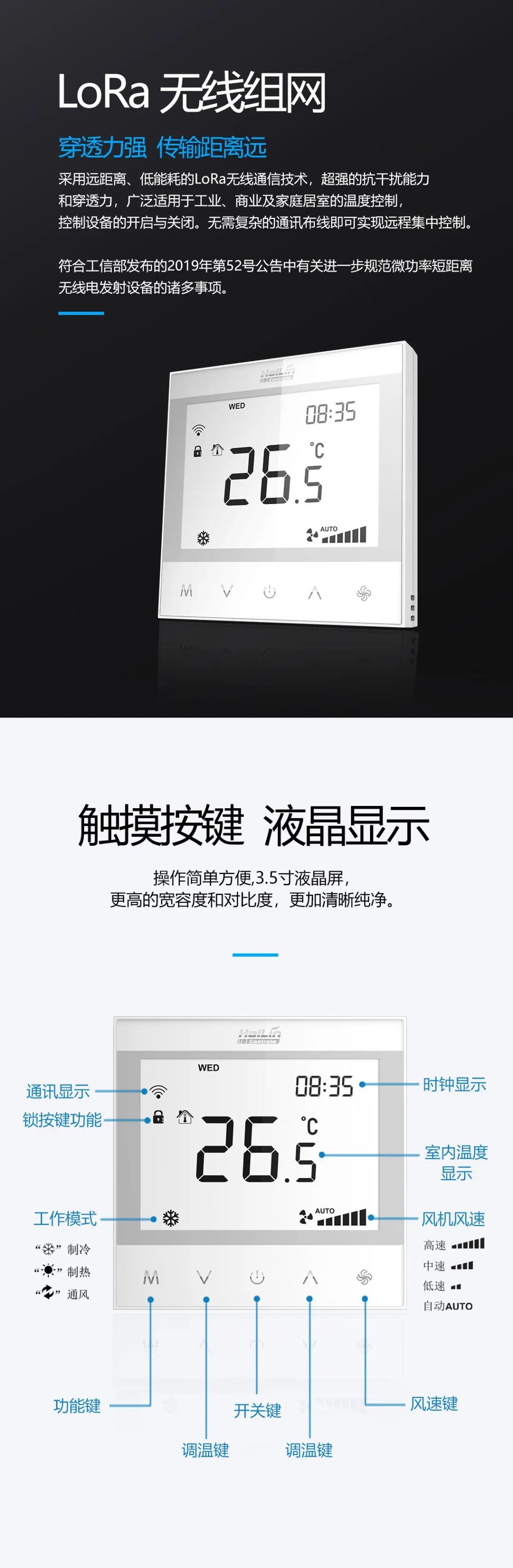 海林最新推出的HL7031無線LoRa溫控器,是溫控器與LoRa無線模塊的結(jié)合,適用于工業(yè)、商業(yè)及家庭居室的溫度控制,同時應(yīng)用在樓宇集中控制系統(tǒng)中。