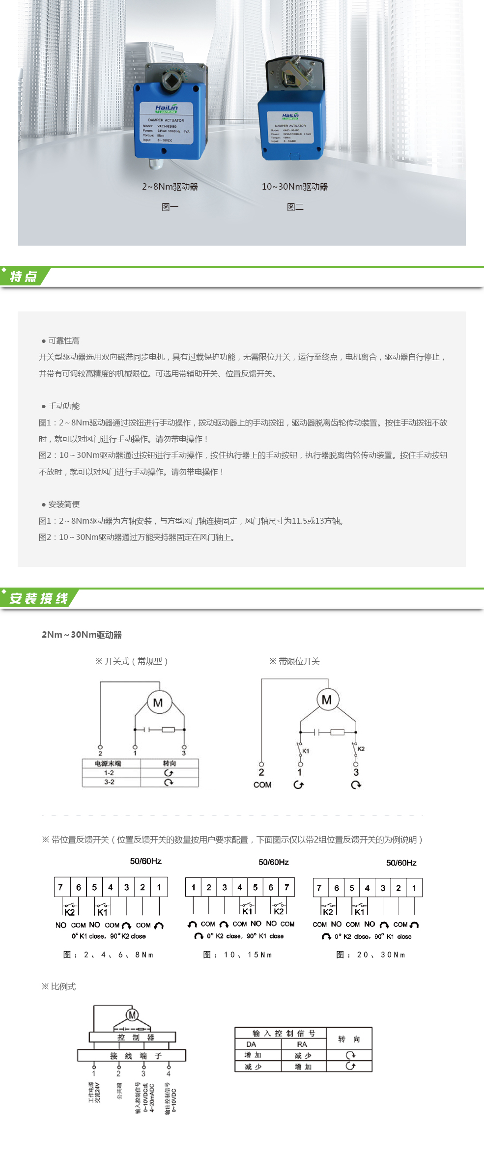 VA03系列風門驅動器采用雙向控制,可提供2~30Nm扭矩,直接安裝于風門、通風百葉窗等裝置上,實現開關、比例式0~10VDC或4~20mA信號控制,并提供0~10VDC的位置反饋信號。廣泛應用于采暖、通風、空調等樓宇自控系統(tǒng)。