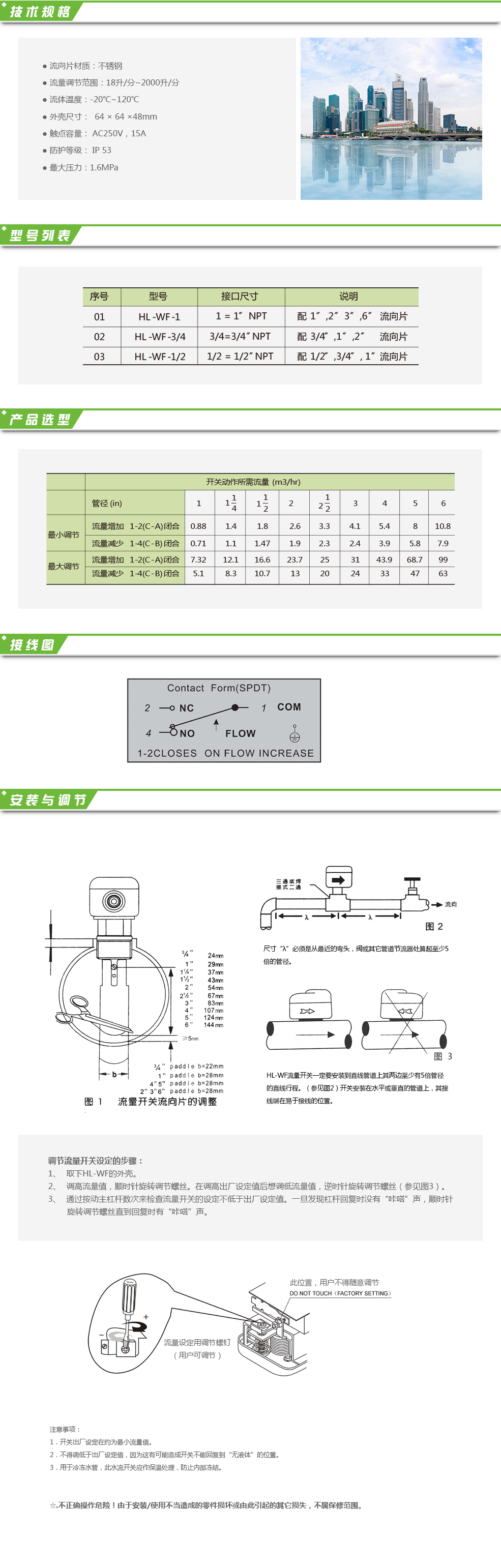 HL-WF系列液體流量開關(guān)用于測量流經(jīng)管道的液體流動狀態(tài),例如:水、乙烯、乙二醇或任何對黃銅、不銹鋼無腐蝕作用及未被定為危險液體的流體,其典型應(yīng)用是使用在需要有連鎖作用或“斷流”保護(hù)的場所。